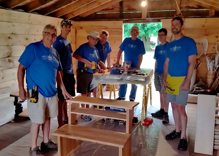 David Brubacher (left) with volunteers from St. Jacobs Mennonite Church building desks.