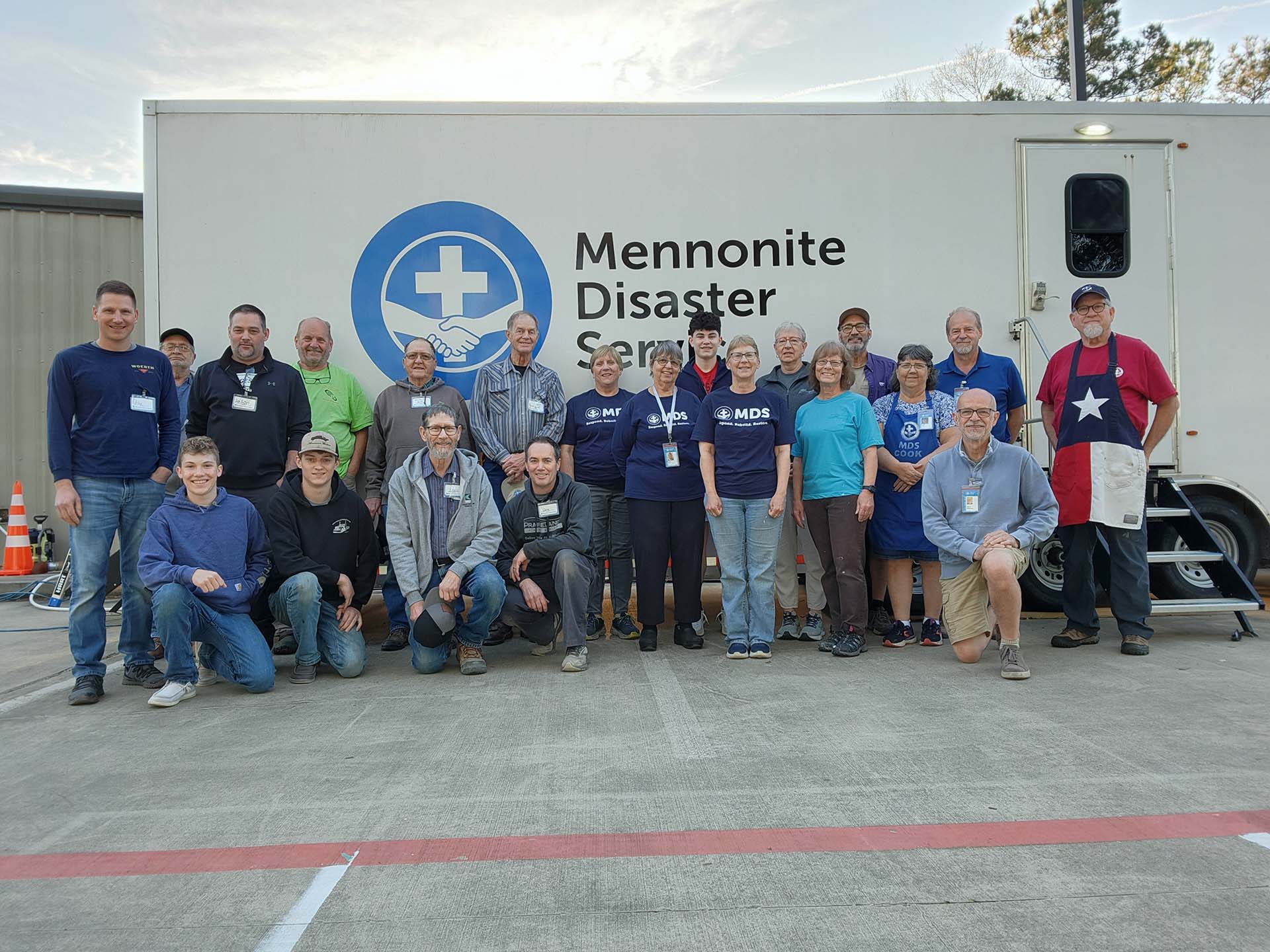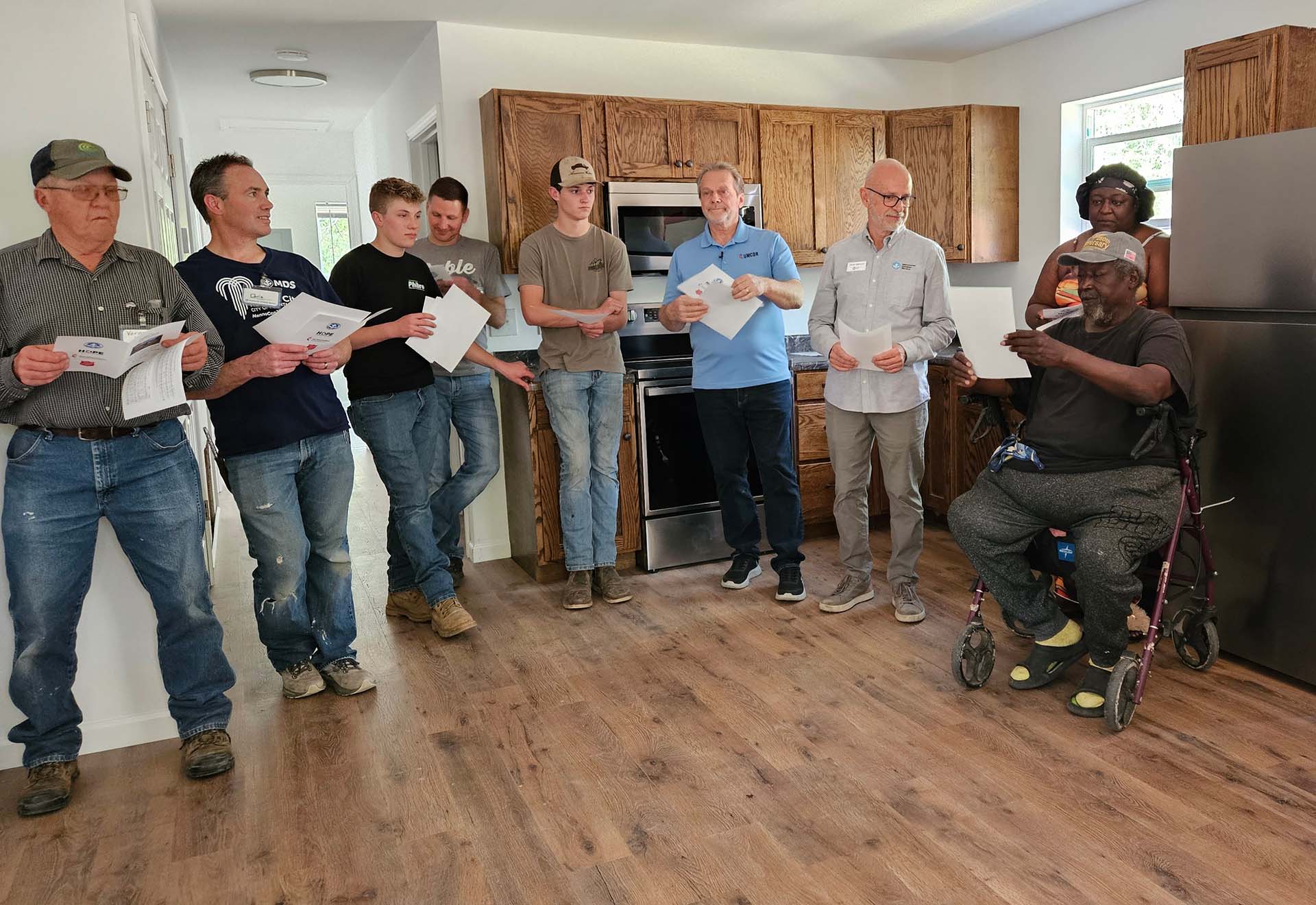 This week’s volunteers, consisting of a group of 10 folks (including one teenage grandson) from the Alexanderwohl Mennonite Church in Goessel, Kansas, and 2 dads with their teenage sons from Lancaster County, Pennsylvania, were able to join us for the joyous home dedication ceremony at the Crumbley house. In addition to the family, we were joined by Godfrey Hubert, Marcus Carlson, and several other staff members of Hope Disaster Recovery (HDR) (our partner here in Conroe), and Matt Troyer-Miller (MDS Regional Operations Coordinator for Region 3). Portions of the event were filmed by the Texas Annual Conference of the United Methodist Church, of which HDR is a part.