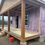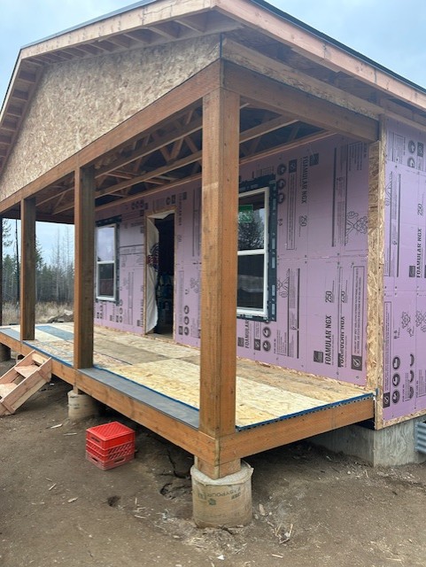 A group of eight weekly volunteers from Madison Mennonite Church, Madison WI, spent the week in Elk. By the end of the week, bundles of shingles were on the roof (with the help of Bill’s equipment). The front decking on house #1 was completed; exterior foam board done; purple insulation and windows installed.