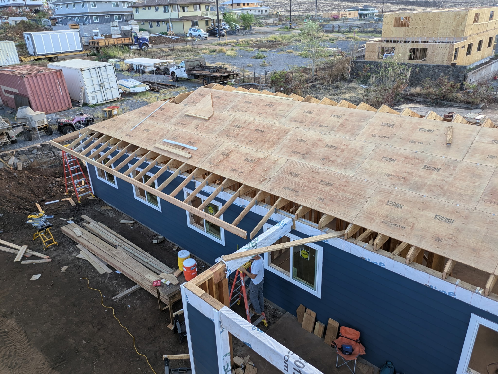 Our most exciting accomplishments this week were putting roofs on the Kahahane and Yadao houses. At the Kahahane house, truss installation was completed, and the soffit and bird blocks installed. Those required painting. Building the trusses for the Yadao house was no small matter, especially on a tight lot with very red and very fine dusty soil. Happily, by week’s end, most of the trusses had been assembled and put up, and the sheeting was half done. The ongoing loan of Eric’s telehandler has been essential, as well as the ability of one of our volunteers to operate said machine! [Eric and Brandy Cajudoy are the local contractors with whom we are working, a very good partnership!]