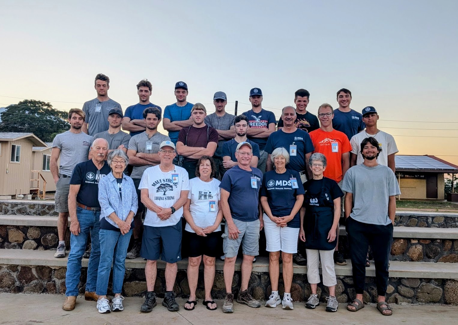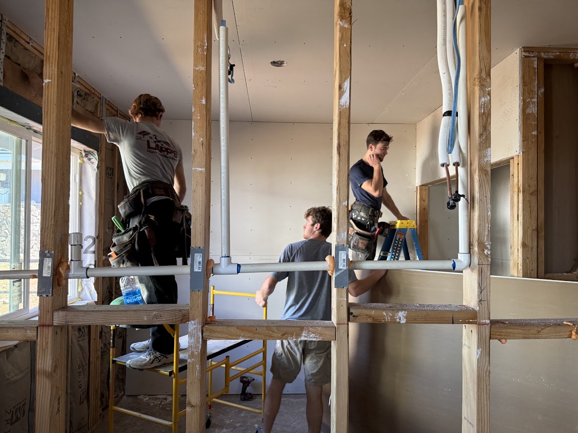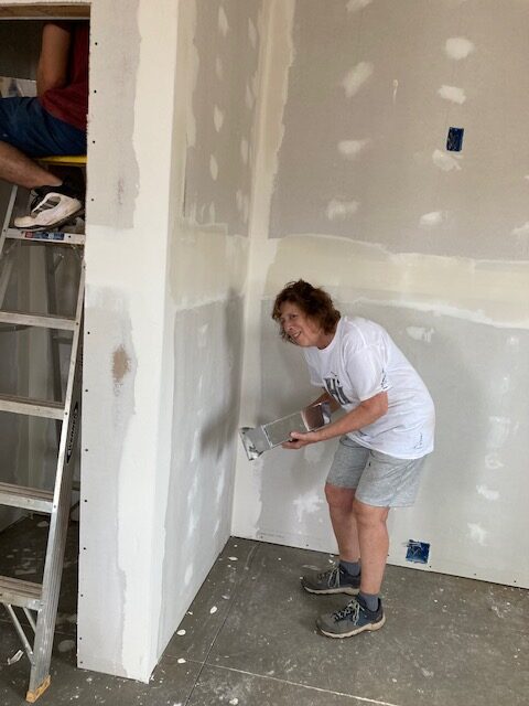 The volunteers on site Monday framed interior walls on the Ho’opai house, hung sheetrock on the Yadao house, and put joint compound and tape on the drywall in the Kahahane house—where the inspector came and approved!