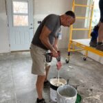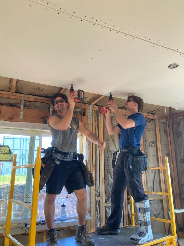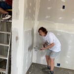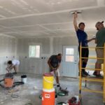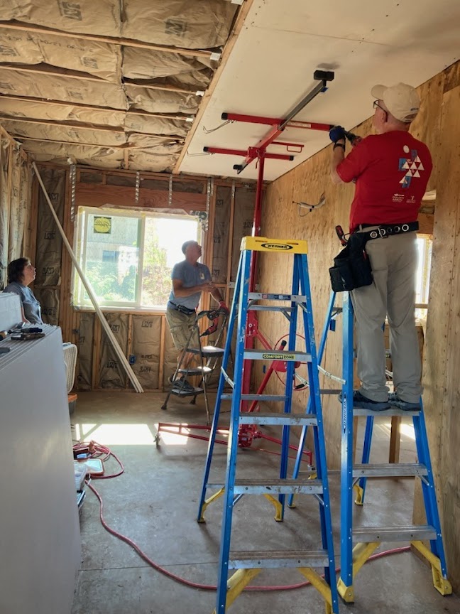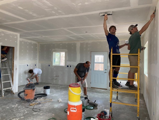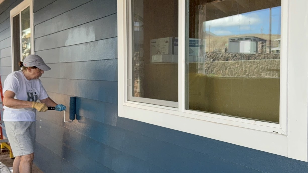 Volunteers continued to paint the outside of the Yadao house and put sheetrock on the inside walls on Thursday.  On the Ho’opai house, volunteers framed for the Lanai beams and fastened hurricane straps.   The third crew sanded and mudded the Kahahane house.