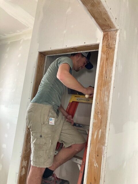 Volunteers framed Lanai beams and added blocking to all walls on the Ho’opai house Friday. Other volunteers finished painting the outside of the Yadao house and almost completed the inside sheetrock work.  The last crew continued sanding and mudding the Kahahane house.
