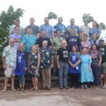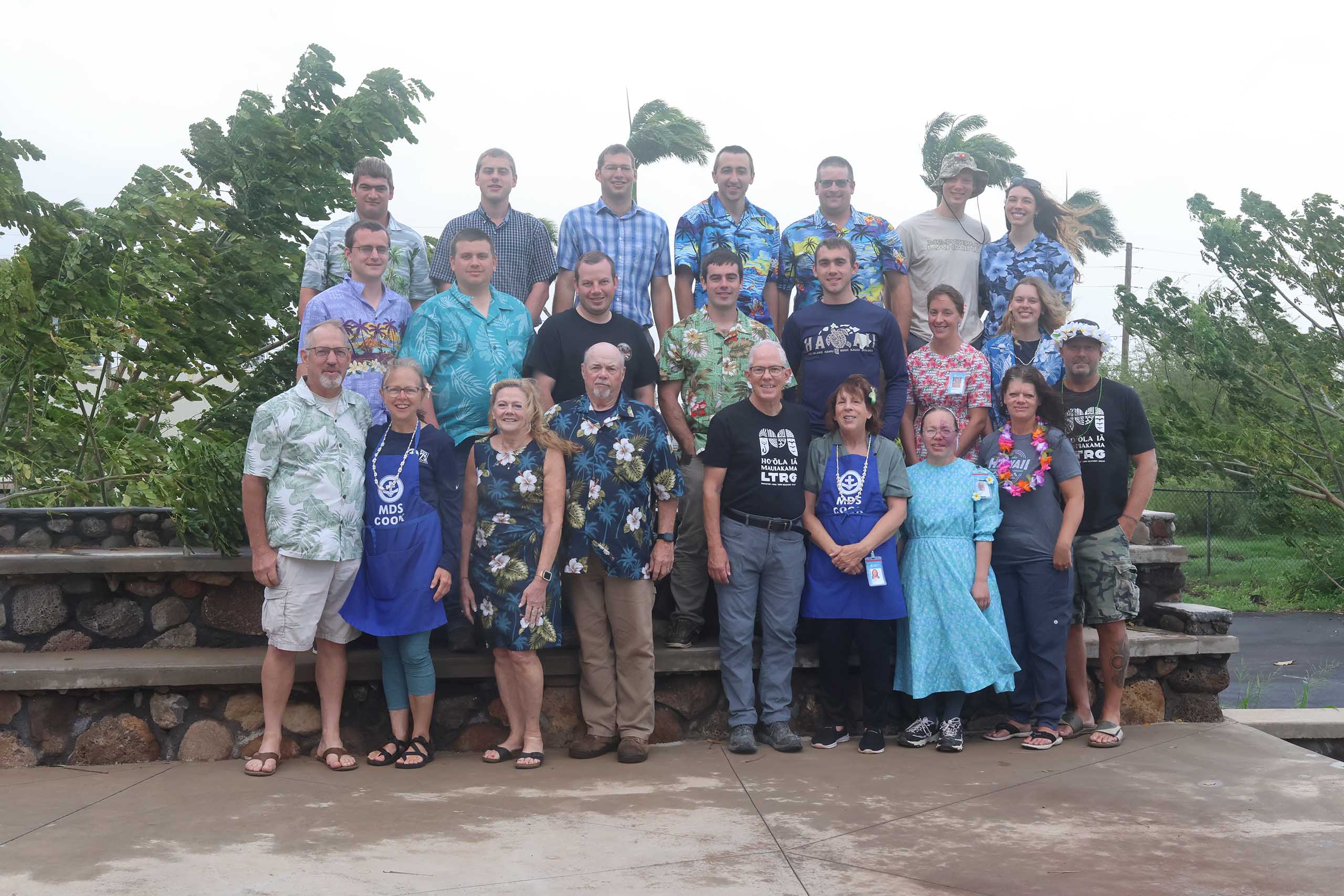 The last two weeks in Lahaina have been quite interesting. We are experiencing the worst tropical storm they have had here in over forty years. It is still blowing and raining. This morning, after breakfast, we went out looking for a nice spot for a group picture. Much to our surprise the sun came out and we saw a rainbow. By the time the camera was set up, the wind and light rain started again. We all reacted when the camera started to blow over. Our camera person, Travis, said stay put and he fixed the camera for another quick shot. The only sunshine we have had here is on the faces of the volunteers!