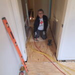 In Karen J’s house the floor joists were already in place. Cindy and Karen cut shim strips for floor joists, and Norm, Steve and Pete installed blocking for the floor joists. They all continued with cutting and installing subfloor in the living room, hallway and bedroom #3 during the rest of the week.
