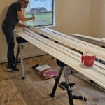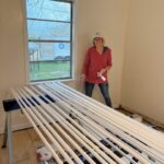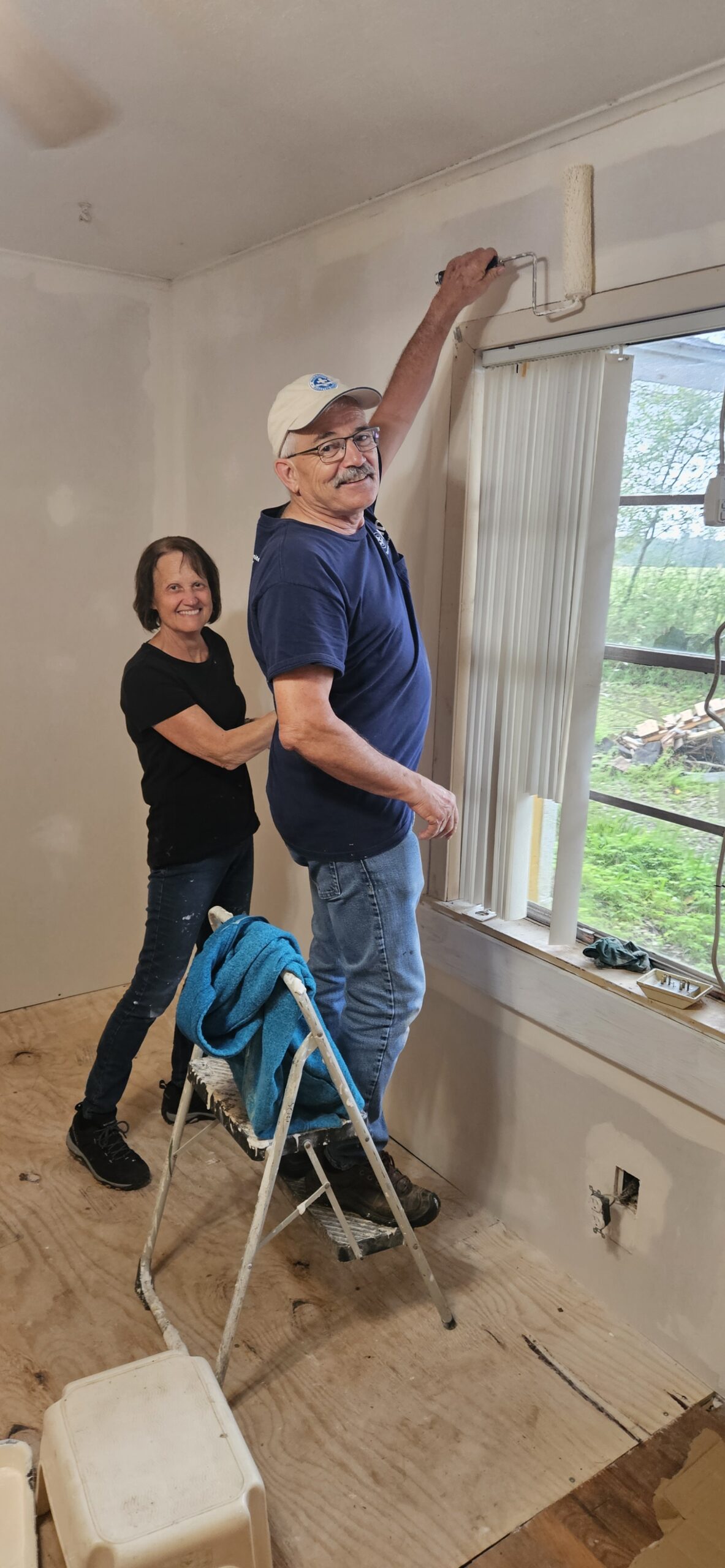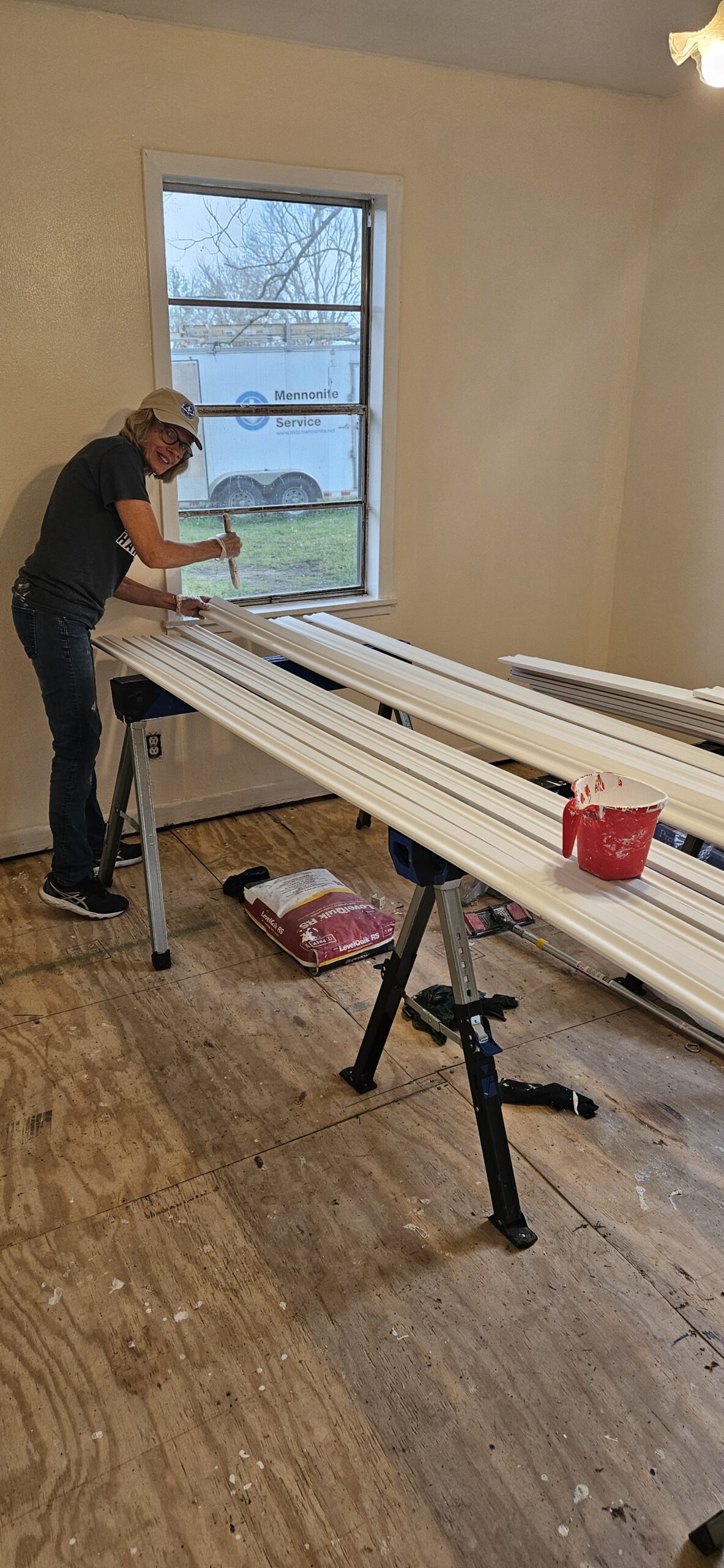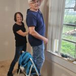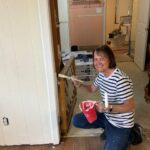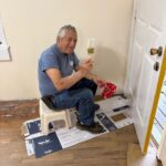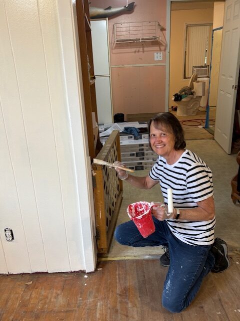 Bill, Lorna, Milton, Merv and Loretta E, all started their week painting throughout Karen’s house. Loretta E painted baseboards, and ceiling, door and window trim. Lorna also painted trim and living room walls. Bill painted bathrooms #1 and #2 as well as doors and trim. He also installed ceiling tiles. Merv installed a new bedroom door, painted walls and trim and installed flooring with Milton. Milton also painted living room walls and trim. Pete installed flooring in bathroom #2.