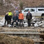 On Tuesday the volunteers divided into three crews to work on three different bridges, one of which is 35 minutes away. The Mauldin bridge was finished but just needed some finishing touches to the driveway and edges to make access easier, so that was finished on Tuesday. At the Briar Hollow bridge, they formed the concrete and began the process of putting planks on the I-beams. Throughout the rest of the week the crews concreted the end walls, finished the decking and railing, finished the stone and completed that bridge. At the Cordova bridge, footer excavation, rebar and form work was begun and continued through Thursday, when the volunteers also drove in the pilings. On Friday the volunteers started setting up the construction for the new Blue Rock bridge that will be built.