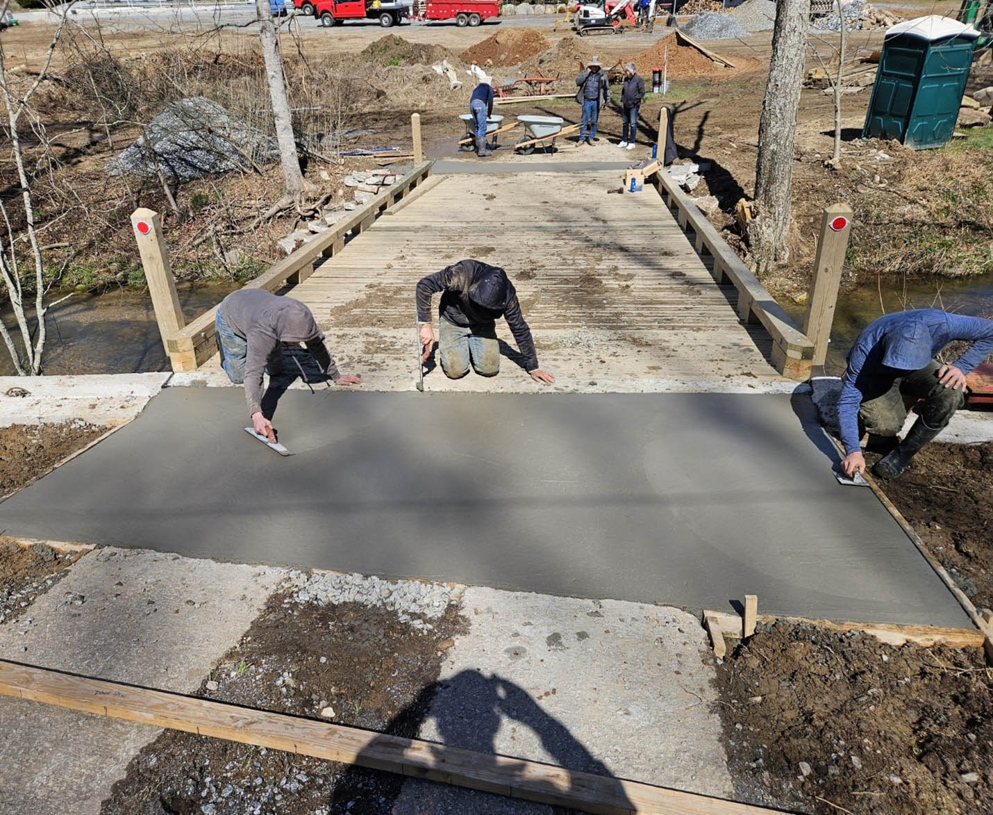 This week we poured the approach for the Kerber bridge with concrete which is unusual but since the bridge was at an angel it seemed to be the way to go. Everything was cleaned up from this site and the Allison bridge started with piles and forms. At the Allison site we installed a temporary culvert for better access. By the end of the week the decking was on and the end walls were poured, the only thing left was the curbing which will happen next week. Another bridge is almost complete with a very happy new bridge owner!