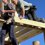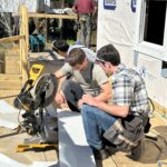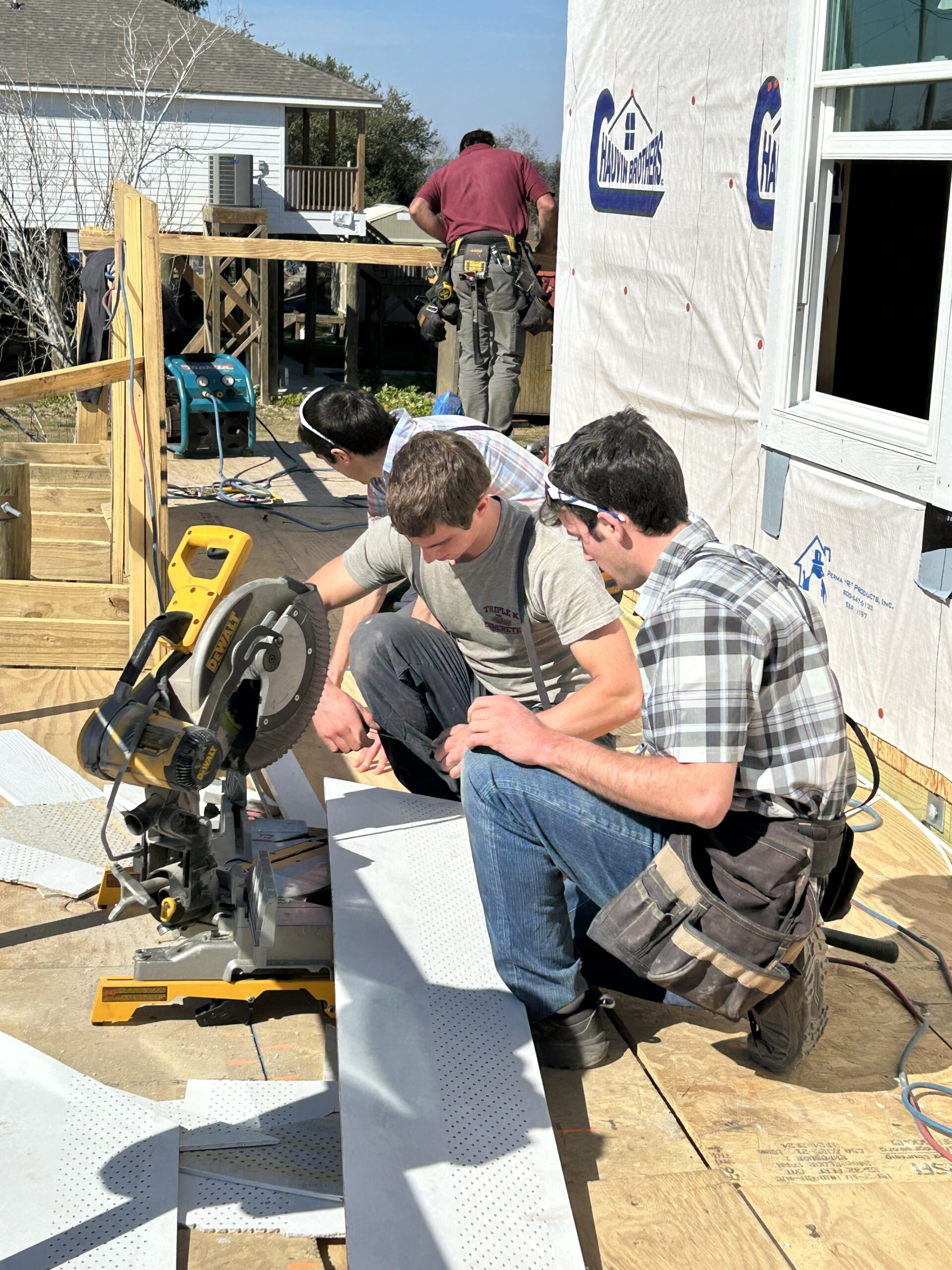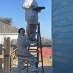 The team working on project #2 (Roger) almost finished the exterior!  This house is shingled, sided and painted with a nice turquois, windows are trimmed, a concrete base to the front stairs is in and the side porch stairs ¾ finished. Soffit, facia, windows and doors are installed, calked and trimmed. They removed the scaffolding and decking in preparation of moving it to another project. We are excited to experience the looks on the owners’ faces when they get home from work and see the progress.  This group worked later than planned on Friday just so that they could get a bit more done before heading home. It was a wonderful week.