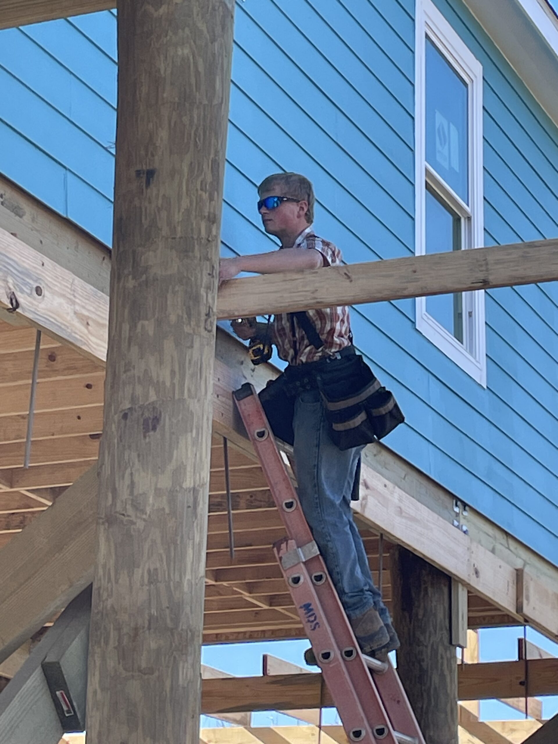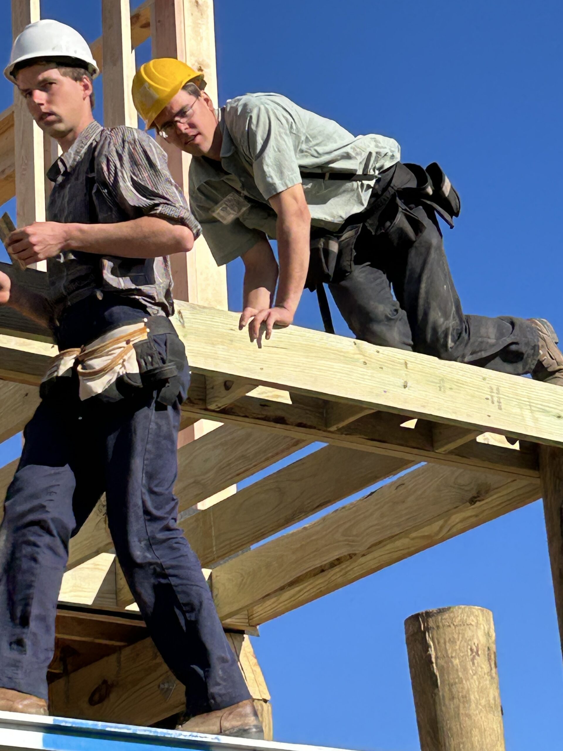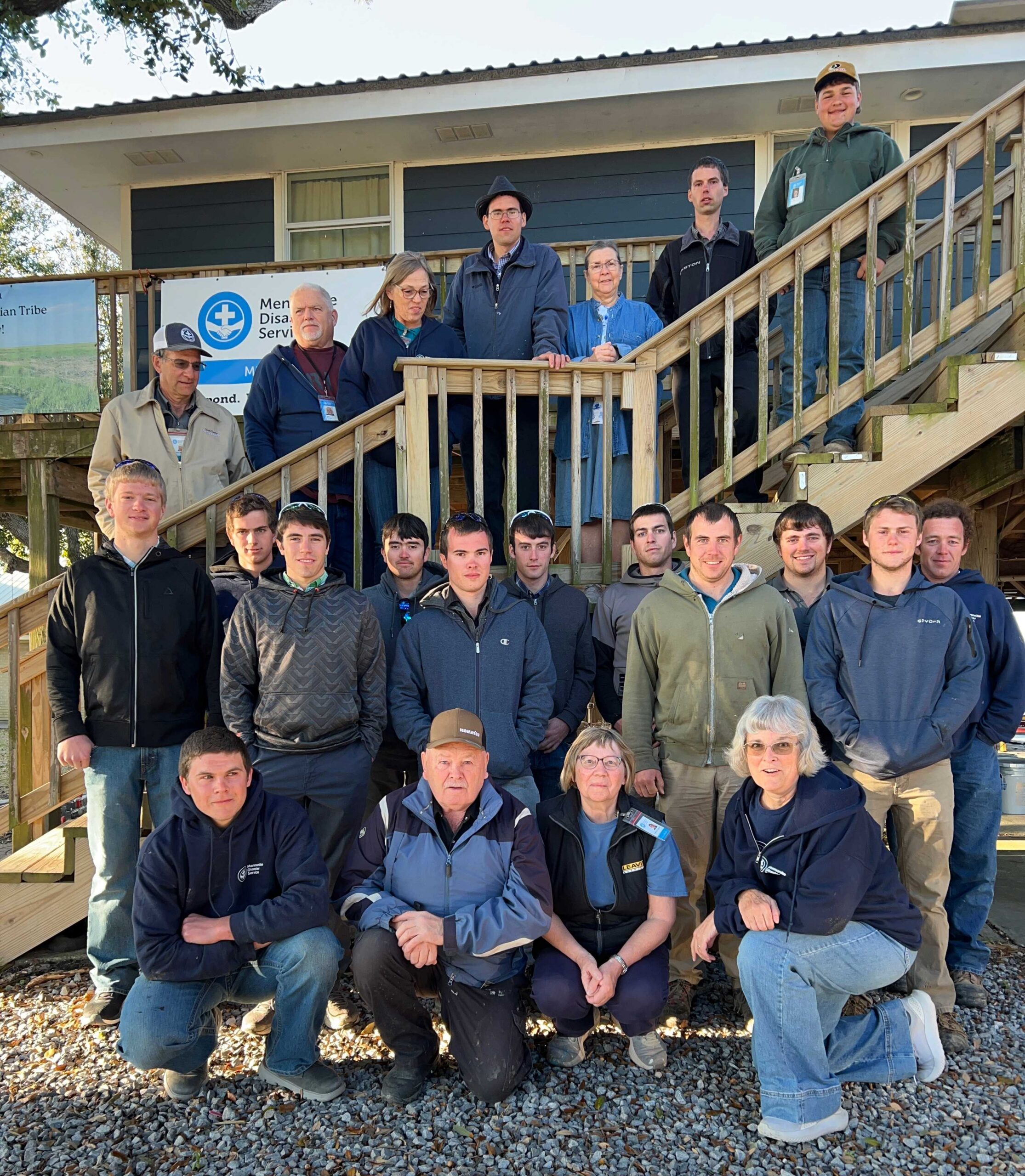 Jason, MDS driver of volunteers extraordinaire, with his assistant driver, Titus, transported 10 other young Groffdale conference men from Lancaster County to work with us in Pointe-Aux-Chenes, LA for the week of February 1 – 9, 2026.  Ingrid of Nova Scotia came with her husband, Ralph, Crew Leader for the month, to work for two weeks. She worked primarily painting. She is careful and productive. The volunteers worked on three different sites all week, and have instilled hope and enthusiasm in this community yet again.  They worked on project #4 (Grace) installing subfloor and exterior walls as far as they could before more pylons needed to be placed (these were completed on Friday). This team then moved on to project #3 (Jade) because the pylons were completed.  They installed the pylon beams, floor joists, subfloor, interior walls, and framed up a porch. They got a good start on the X-bracing also.