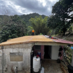 At another house they tore off old metal from the roof, installed plywood over the T1-11, then applied the water shield and installed the galvalume. They stabilized the roof from the inside, and finished screwing tin, installed braces, drilled and bolted board to concrete walls and cleaned up the interior.