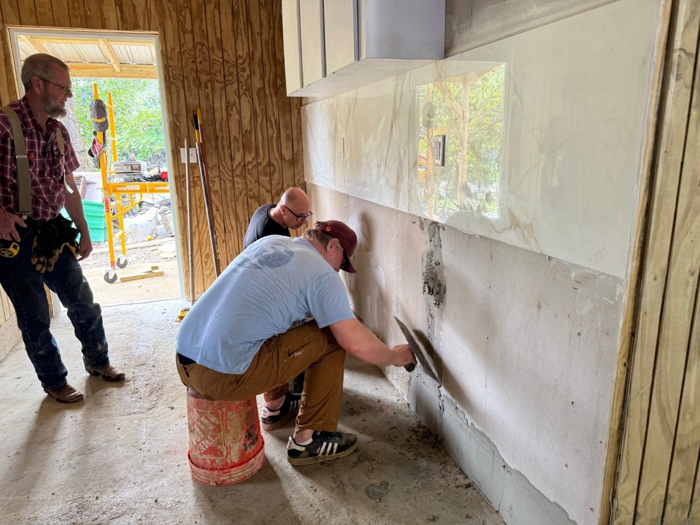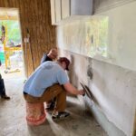 Since one house was a new build, there was lots of inside work to be done. They finished installing the T1-11 on the ceiling and put up crown molding, put tiles in the shower, skim coated cement walls, and finished the plumbing. The flooring was completed, as well as the tiling in the bathroom. Kitchen cabinets were installed, and 3 of the 4 interior doors were hung. The crown molding was finished, the doors were trimmed, the walls were painted and the tile was completed on the floor.