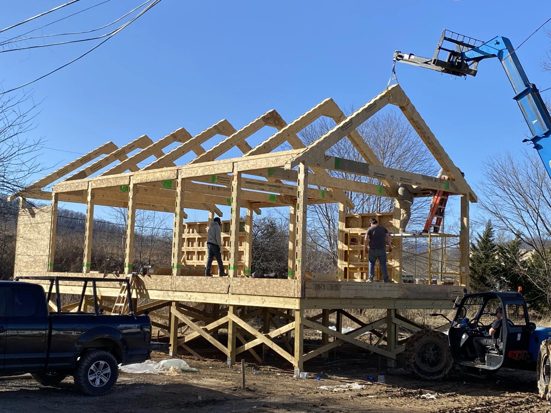 Tuesday a group went to continue work on a CONSTRUX house.  Work had begun in November, but some of the pieces were damaged.  Each piece had to be planed so the swollen OSB components fit.  Progress was slow and at times the volunteers were very frustrated and discouraged.  Friday they assembled and raised the trusses.  Being able to do that was gratifying as they saw that finally some progress was being made.