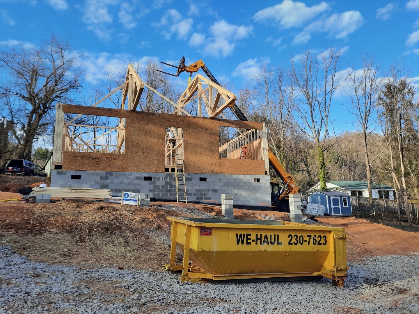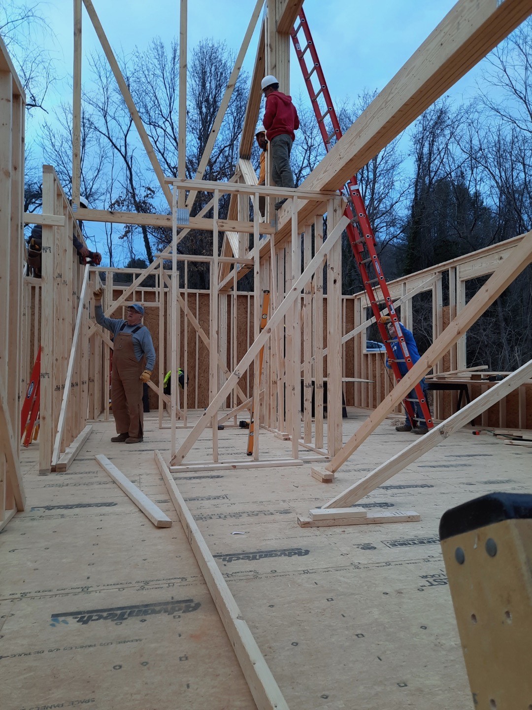 This week volunteers worked at hanging drywall at the Culler House. Volunteers continued with siding installation and drywall work at the Gay House. At the new build/Gyska House, crews began placing floor trusses and plywood decking. All exterior and interior walls were built and placed. By Thursday roof trusses were being set.